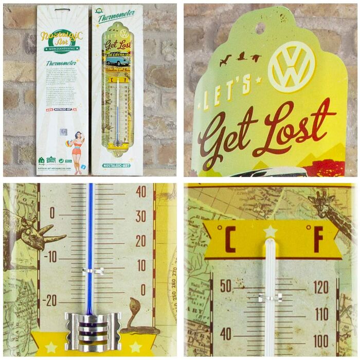 Le thermomètre en Métal du Combi VW a une double lecture de la température : C° / Degrés Celsius et F / Degrés Fahrenheit. Thermomètre VW Combi T1 doit être installé à l'intérieur. Ce thermomètre du légendaire bus VOLKSWAGEN Kombi T1, Let's Get Lost, Adventure is out there ! est issu de la Collection Nostalgic Art.