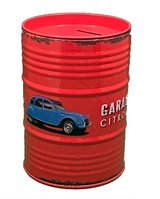 Un fût d'huile comme tirelire pour les fans de Citroën, Tirelire conçue en Métal, Dimension : Hauteur de 12.5 cm et un Diamètre de 8.5 cm, avec couvercle amovible et une grande fente pour les pièces et les billets. Finition effet vieilli. Produit fabriquée sous Licence Officielle Citroën. Coloris : Rouge.